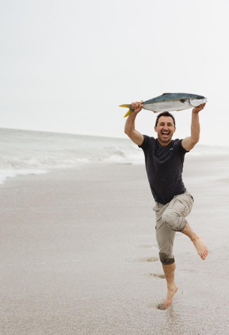 In Cape Town, Ryan and his crew voyages 80km out to sea and land a full catch of yellowfin tuna using traditional pole and line fishing techniques dwarfed by a deep sea trawler in the background.